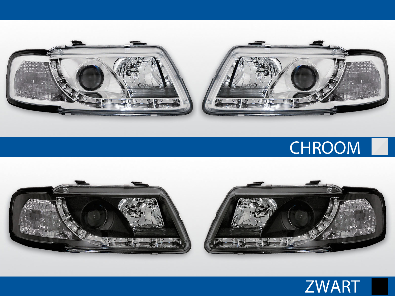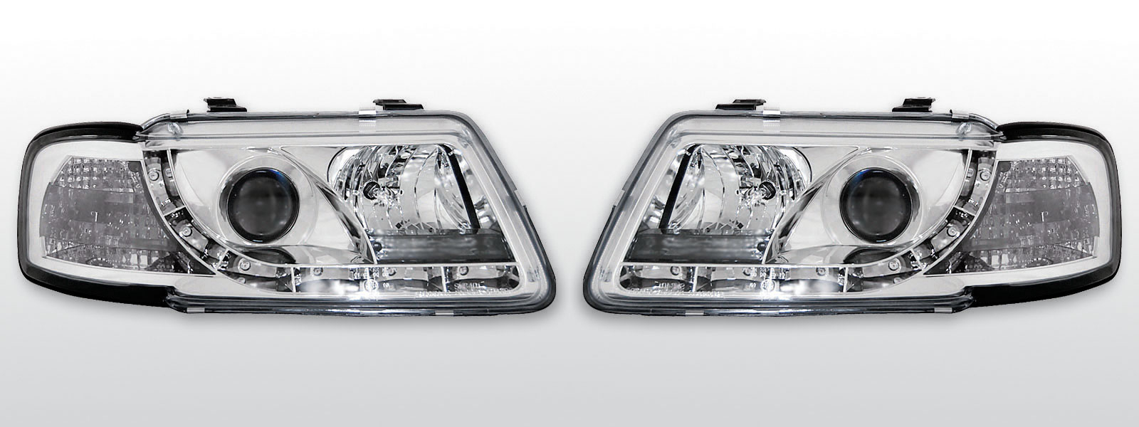 Complete koplampset met LED stadslicht strip en xenon look lens. De koplampen zijn bereid voor de originele motor van de automatische hoogteregeling. De set is voorzien van een E-keurmerk met goedkeuring voor devil eyes dagrijverlichting. De led's worden op het stadslicht aangestuurd.