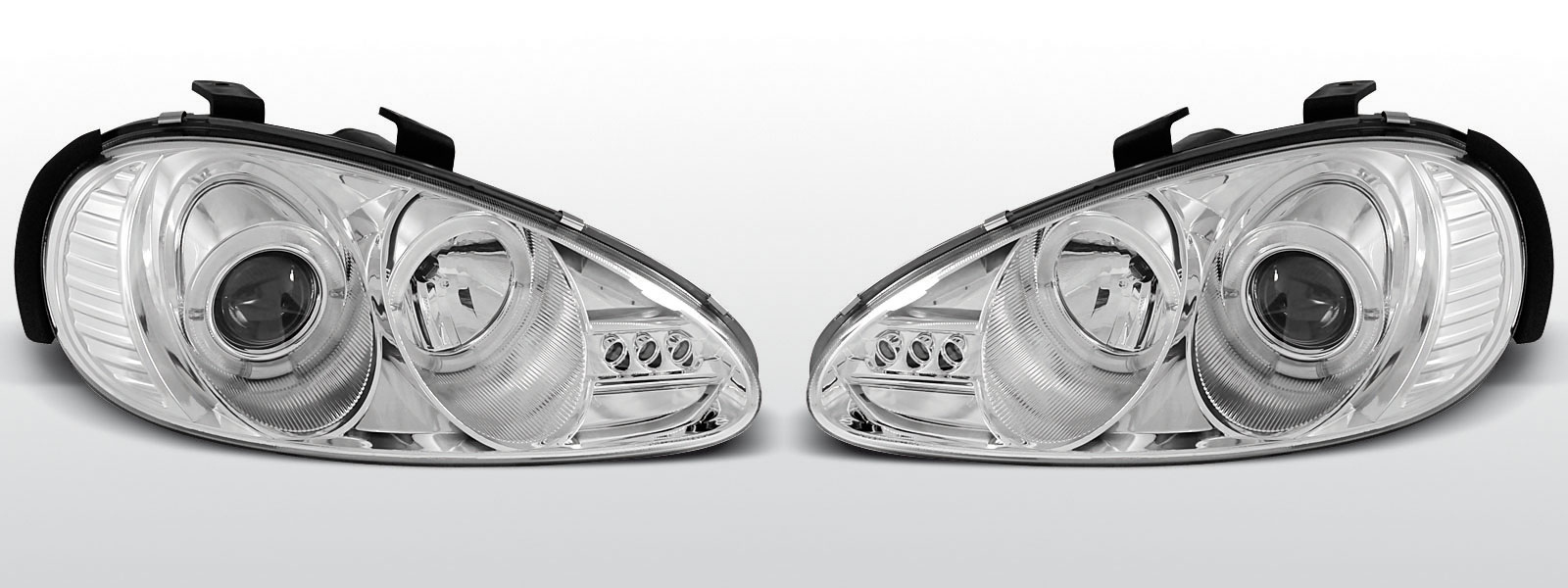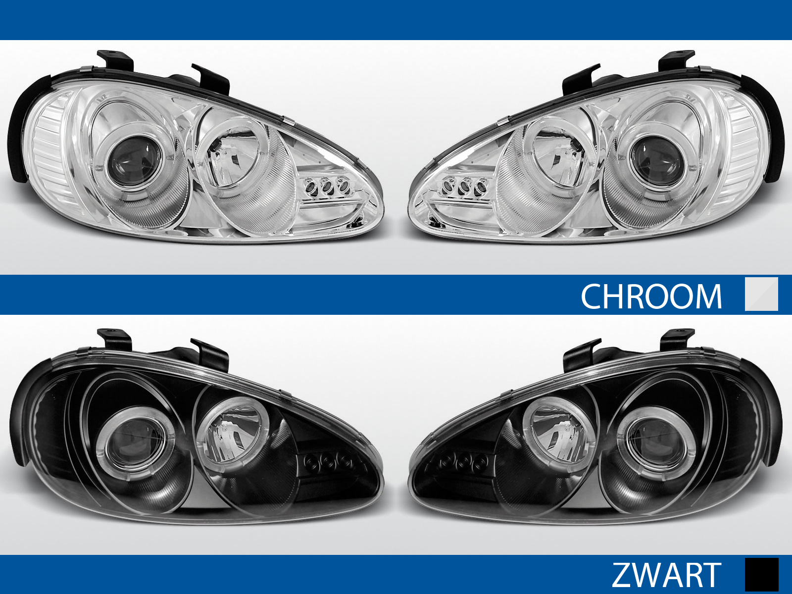 Complete koplampset met Angel Eyes, positieled's en xenon look lens. Leverbaar in chroom of zwart. De LED Angel Eyes geven een moderne look. De koplampen hebben een xenon look lens met H1 fitting, de H1 lamp is meegeleverd. Daarnaast zit een open reflector met een H1 fitting (eveneens meegeleverd). De 3 positieleds maken de moderne looks af.