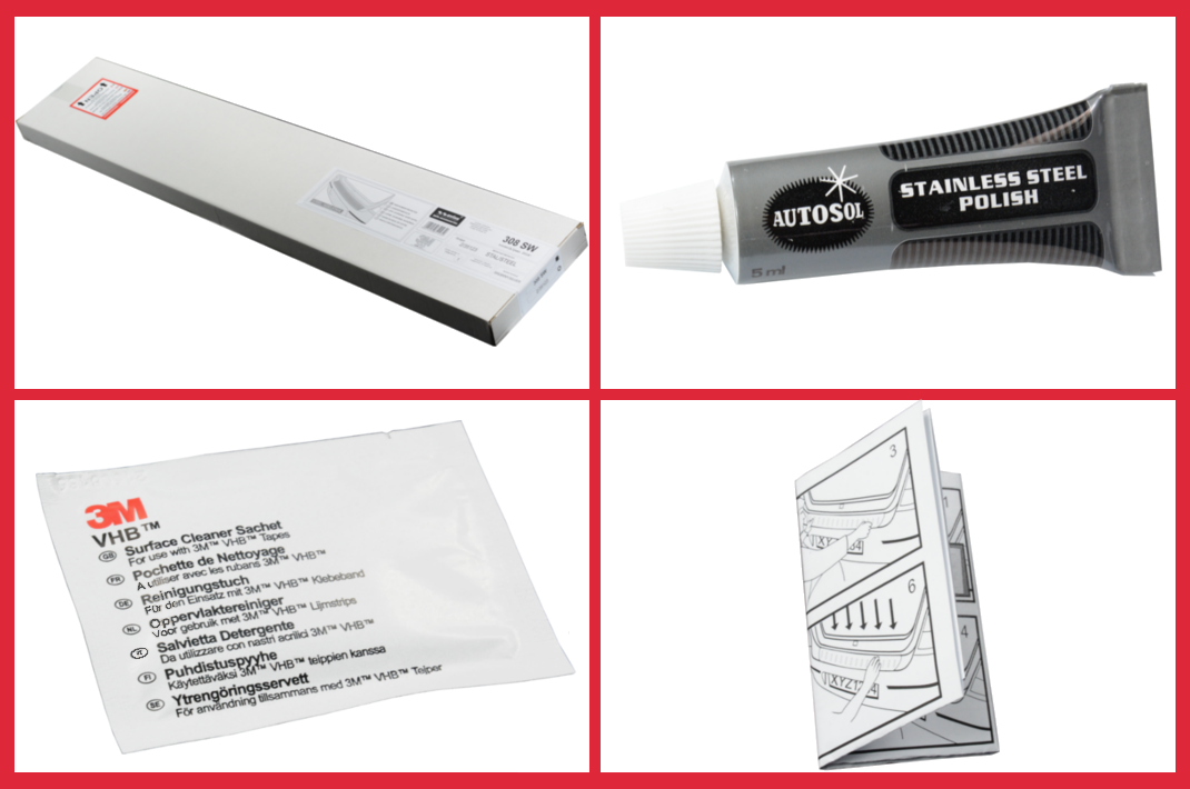 Achterbumperbeschermstrip, cleaner (ontvetter) doekje, dubbelzijdige tape en montageinstructies.