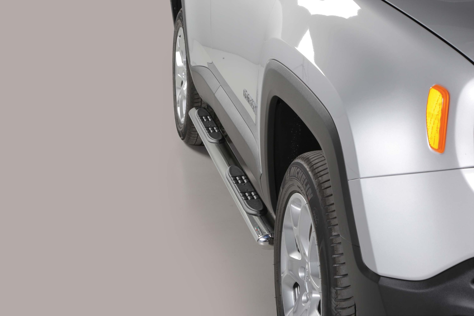 Bescherm en verfraai je auto met een " Pedana " side step set van de Italiaanse topfabrikant: Misutonida, fabriceert deze side bars van hoogwaardig 50 mm RVS . De 100% op maat ontwikkelde steps geven je Jeep Renegade een robuuste uitstraling en beschermt de auto / dorpels tegen schade bij een aanrijding met obstakels.