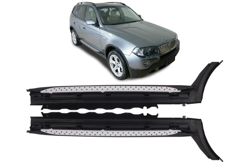 Deze running board geven uw BMW X3 E83 een luxe en robuuste uitstaling. Daarnaast zijn ze ook nog een praktisch bij het instappen. De running boards, ook wel treeplanken of side steps genoemd, zijn gemaakt van ABS kunststof met een aluminium bovenkant die weer voorzien is van de kenmerkende rubber antislip noppen. Door de stevig binnenste draagbalk zijn boards ook goed belastbaar (normaal gebruik instappen / uitstappen). De treeplanken zijn van goede kwaliteit en hebben een uitstekende pasvorm, en worden compleet met montagemateriaal geleverd.