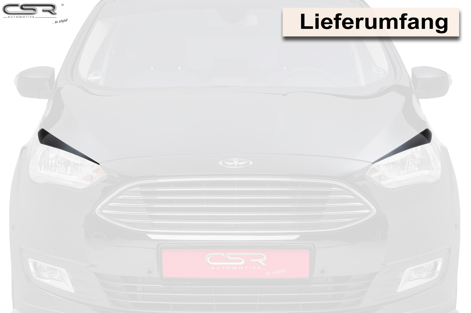 BeschrijvingKoplampspoilers ofwel booskijkers zijn ervoor gemaakt om de koplampen optisch te verkleinen en/of de motorkap optisch te vergroten. Deze koplampspoilertjes zijn autospecifiek pasklaar ontwikkeld en geschikt voor; Ford C-MAX 2015-, 5d mpv, Ford Grand C-MAX 2015-, 5d mpv . Gemaakt door CSR-Automotive en geproduceerd in Duitsland van ABS Kunststof . De booskijkers hebben de volgende afwerking: Geen, product wordt ongespoten geleverd',.