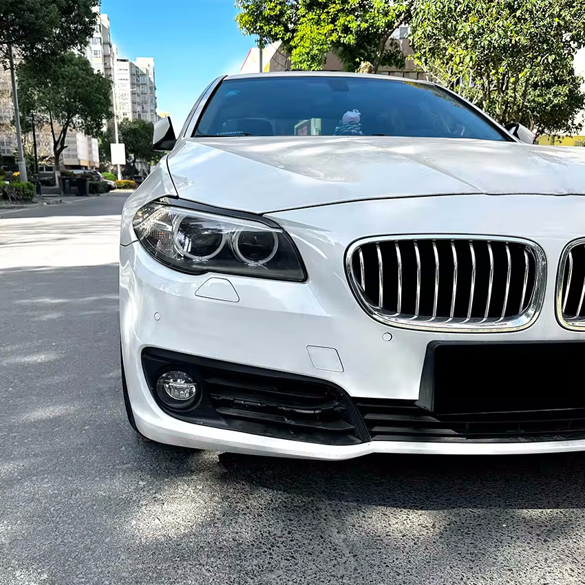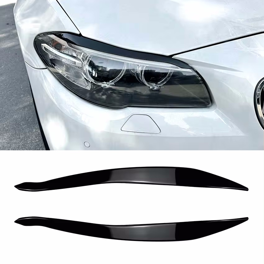 Koplampspoiler set voor BMW 5-Serie F10 LCI & F11 LCI 2013-2017, facelift model. De booskijkers hebben een goede pasvorm en zijn afgewerkt in glanzend zwart.