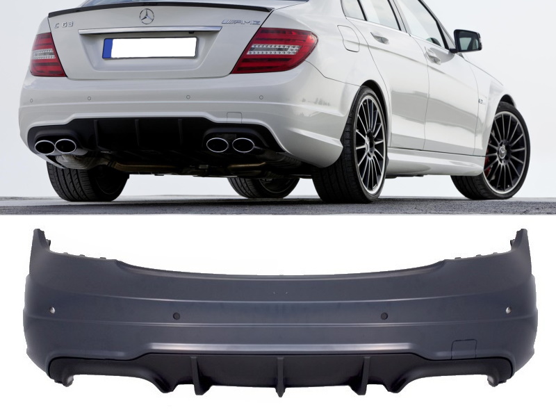 Sportieve en complete achterbumper set geschikt voor Mercedes-Benz C-Klasse 204 sedan en coupé modellen. Als vervanging of C63-look upgrade voor auto's met AMG-Pakket. Ook geschikt als upgrade van auto's met een standaard bumper.