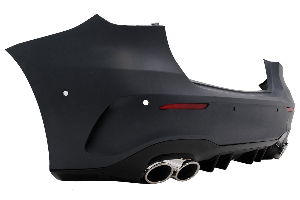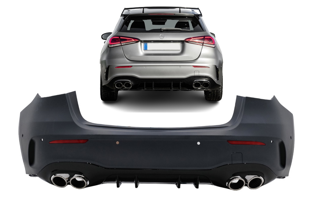A45 AMG-look achterbumper voor Mercedes-Benz A-klasse W177 hatchback. Met deze complete achterbumper geef je jouw Mercedes A-klasse de elegante en sportieve uitstraling van een A45 uitvoering. De bumper dient als vervanging voor auto's met AMG pakket, maar is ook geschikt als upgrade van auto's met standaard bumper. Niet geschikt voor de originele A45 AMG utivoering. De bumper is gemaakt van hoogwaardig ABS-kunststof en heeft een uitstekende pasvorm.