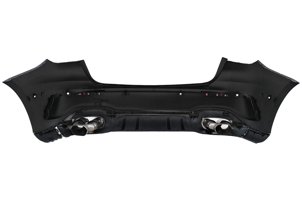Achterbumper; bumperhoes met PDC-houders, diffuers en zwarte uitlaatsierstukken.