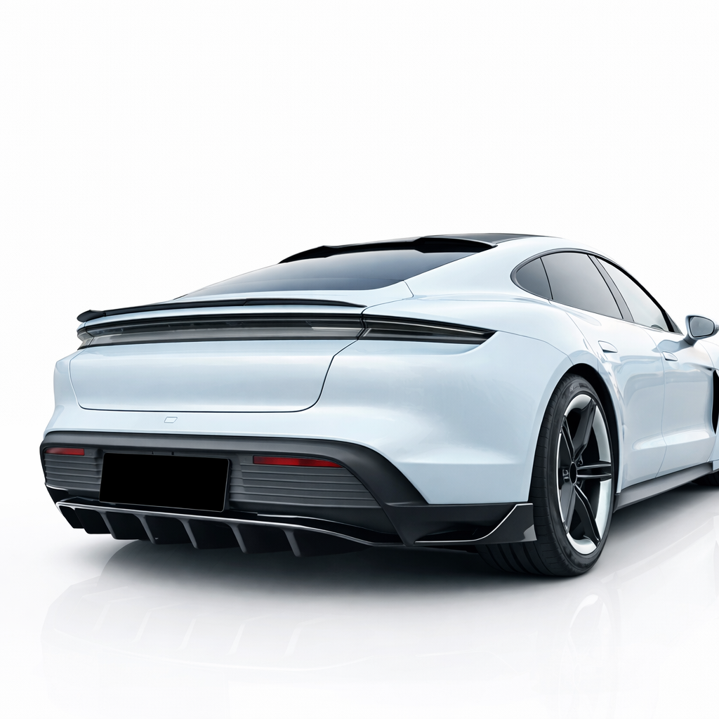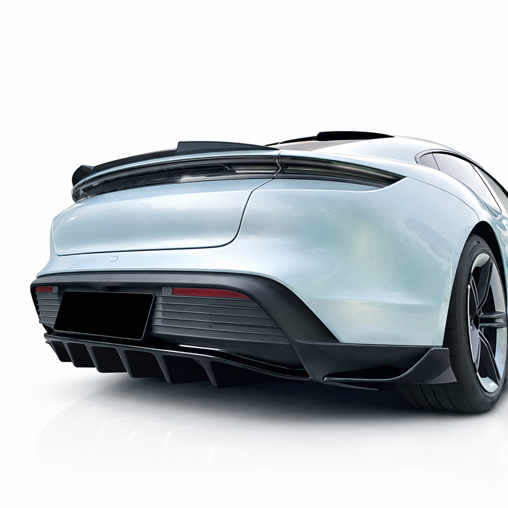 Diffuser pakket voor Porsche Taycan (2019–2024), uitgevoerd in glanzend zwart. Geschikt als zowel vervanging van de originele diffuser als sportieve upgrade van de achterzijde. Ontworpen voor een strakke, premium afwerking die perfect aansluit bij het design van de Taycan.