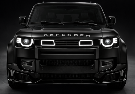 Glanzend zwarte ROCK-look grill met geïntegreerde LED verlichting voor de Land Rover Defender L663, ontworpen voor een krachtige en premium uitstraling.